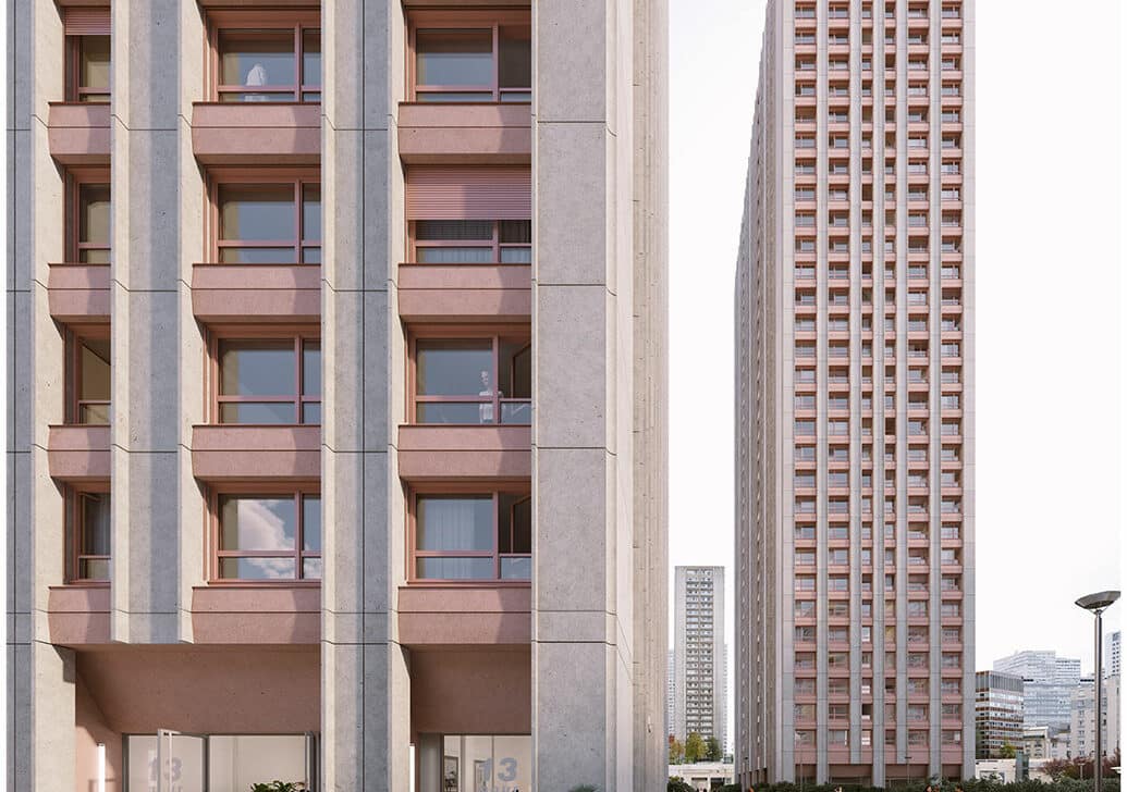 Cette opération majeure se fera progressivement. D’abord en commençant par les deux tours IGH (immeuble de grande hauteur) Londres et Anvers, dessinées par Maurice Cammas. La première est en R+32 et compte 321 logements, du T1 au T5. La Tour Anvers s’élève quant à elle à R+33 avec 264 logements, uniquement des T3 et T4. Elles font l’objet d’une réhabilitation Plan climat confiée au groupement composé de FBAA-François Brugel Architectes, Pluriel(les), le bureau d’études CET Ingénierie et Eiffage dans le cadre d’un marché global de performance (« anciennement conception-réalisation-exploitation-maintenance »). Cette intervention vise à améliorer le confort des habitants d’un point de vue thermique été et hiver et à atteindre des performances énergétiques et environnementales ambitieuses pour un gain énergétique de 54 %. Procédant à l’isolation de l’enveloppe dont le ravalement permettra aussi de soigner les pathologies des bétons, il sera procédé à la réfection du système de ventilation et de l’éclairage des parties communes qui seront également repensées. Des sous-sol au rez-de-dalle en passant par le rez-de-voirie, l’enjeu est de mieux accompagner le parcours quotidien des habitants. Les menuiseries extérieures, les radiateurs et les portes palières seront remplacés et des occultations mises en place. Les travaux, dotés d’un budget de 24,5 millions d’euros HT, débuteront en 2025.