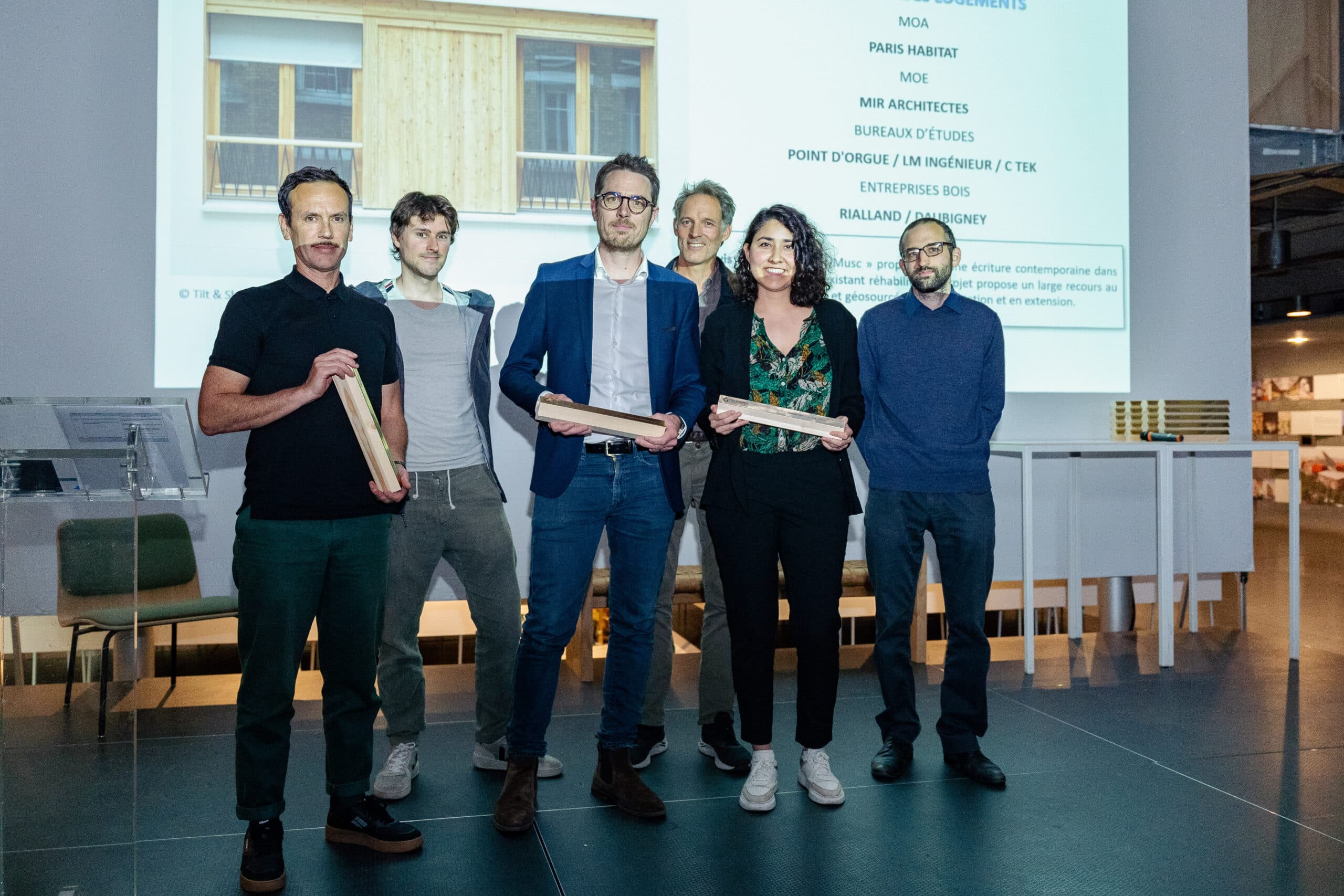 A l’annonce des lauréats, l’équipe projet composée d’Amaranda Sanchez Byrne, chargée du programme à la direction de la maîtrise d’ouvrage de Paris Habitat, de Nicolas Gaudard de Mir architectes et de Laurent Mouly de LM ingénieur, est montée sur scène. Organisé depuis 2012, ce prix remis par Fibois Île-de-France, récompense 8 lauréats franciliens et valorise les opérations bois en Île-de-France.