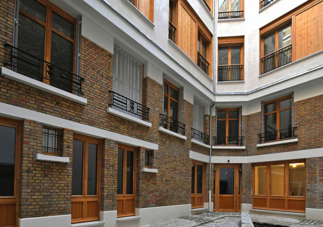 Cette résidence présente 3 nouveaux étages, dont les R+3 et R+4 sont en duplex, s’appuient sur un local en rez-de-chaussée restructuré et transformé en logement. Pour ce faire, la surélévation a sa propre structure sous forme de « tabouret métallique » qui possède ses fondations et ne repose pas sur l’existant. Cette opération s’inscrit dans les objectifs de Paris Habitat de livrer 900 nouveaux logements par an dont 600 à Paris.